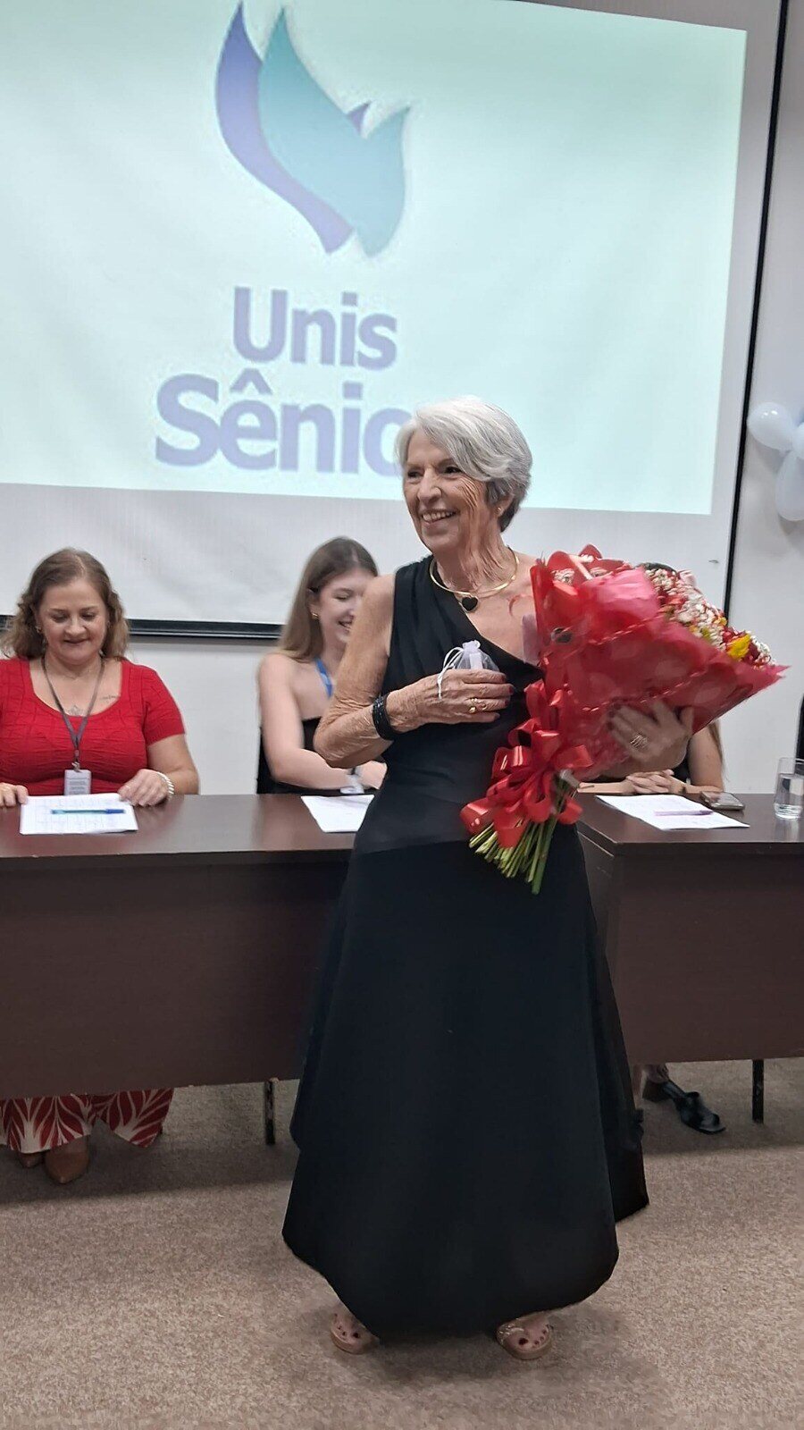 A programação começou em grande estilo com o coral cênico, coordenado pelo professor Ariovaldo Silva, que emocionou a plateia ao reviver clássicos dos anos 60, como "Era um biquíni de bolinha amarelinho". Logo após, a professora Ana Amélia trouxe a magia do Natal com canções em francês, encantando a todos. Em seguida, o evento ganhou ainda mais brilho com uma apresentação de dança portuguesa das alunas do Unis Sênior, ovacionada pelos presentes.